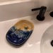 This sea turtle soap dish will look beautiful holding your soap or sponges. This dish is multipurpose and can be used for serving food on as well. It is made from a white highfire stoneware clay. The glazes are all leadfree, foodsafe, and dishwasher safe. The dish measures 6" long by 4" wide.