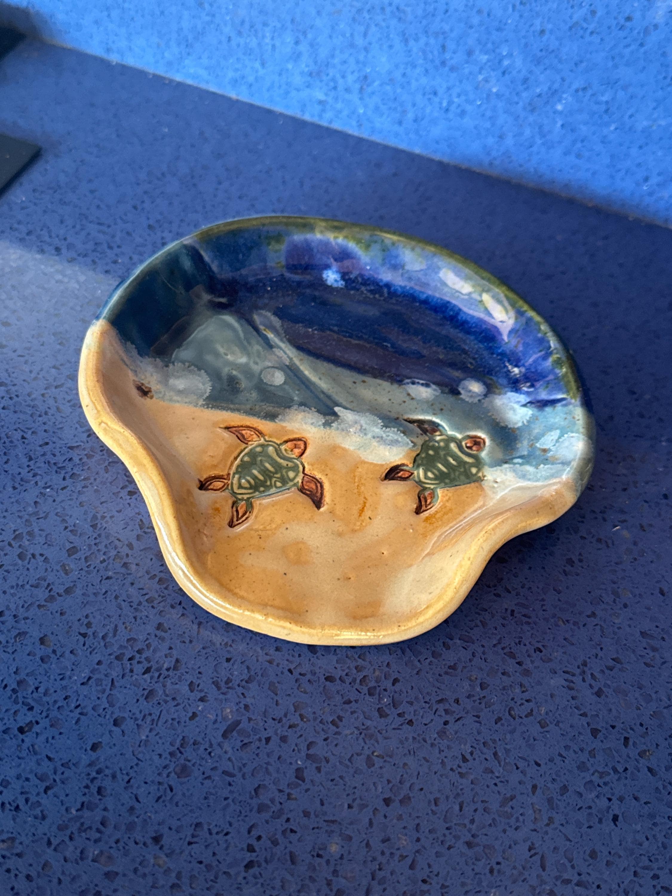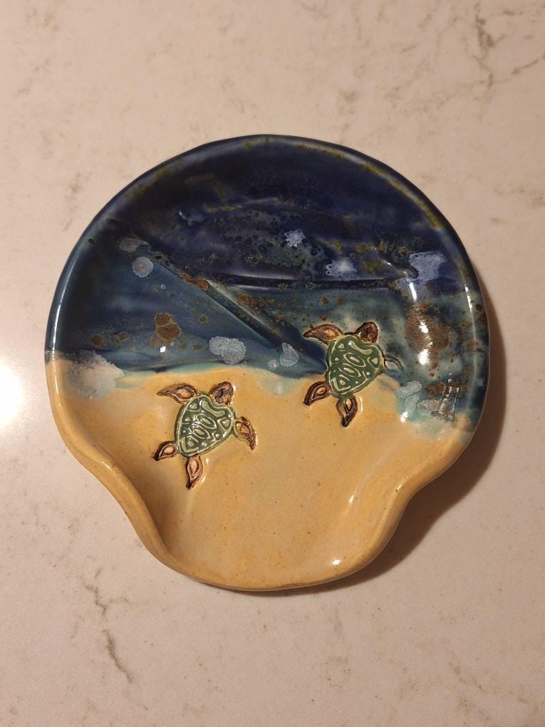 This larger round sea turtle spoonrest dish is made from a white highfire stoneware clay. It measures 5" wide and is the perfect size for resting a large spoon on the stovetop. The glazes are non-toxic, leadfree, and foodsafe. This dish is also microwave and dishwasher safe.