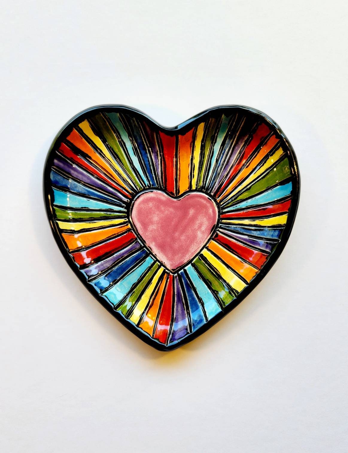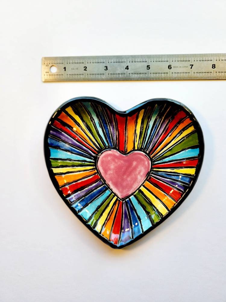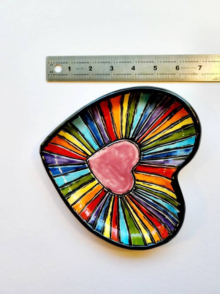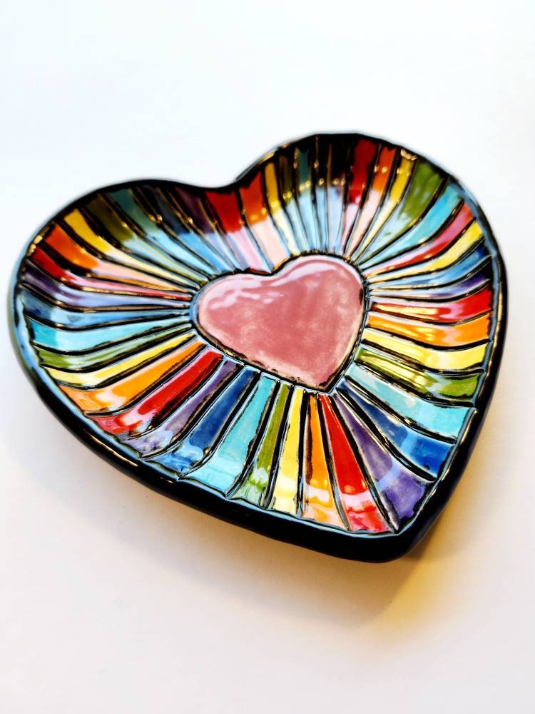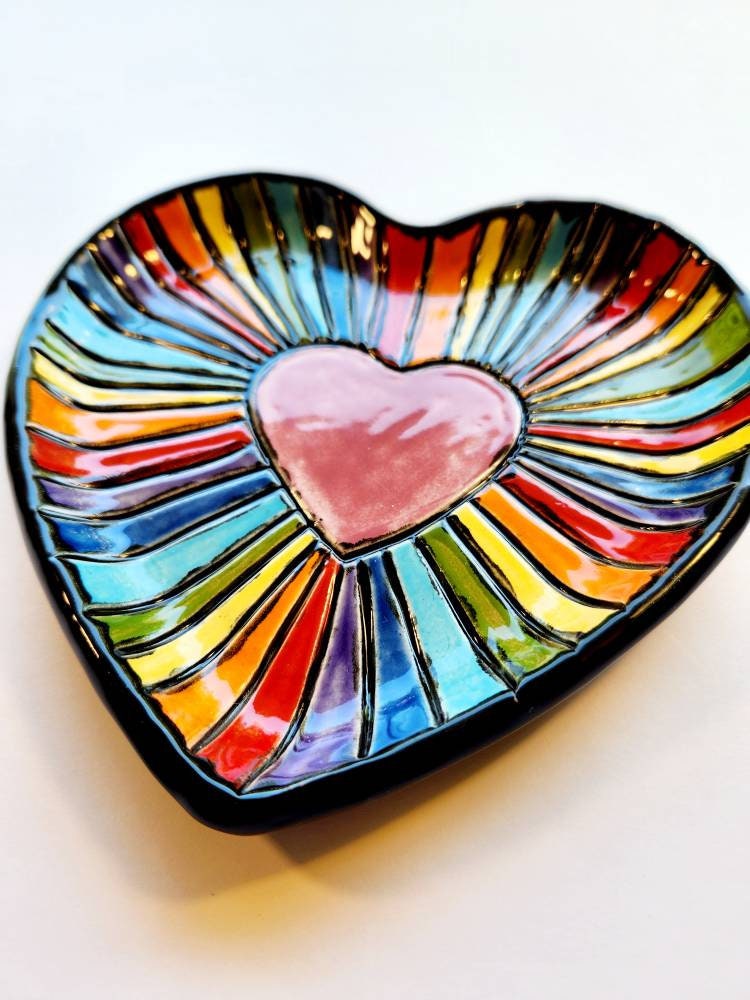 This plate is a real conversation starter. It features a carved heart with rainbow stripes. It is made from a white stoneware clay and is glazed with lead-free foodsafe glazes. It measures approximately 7"x7".