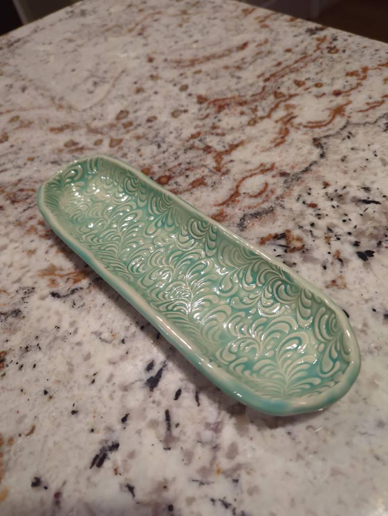 This handmade ceramic cracker serving dish has a translucent aquamarine blue green glaze that highlights the organic spiral texture beautifully. This 10" long by 3" wide dish is made from a highfire white stoneware clay and is microwave and dishwasher safe. You will receive the exact dish in the photographs.