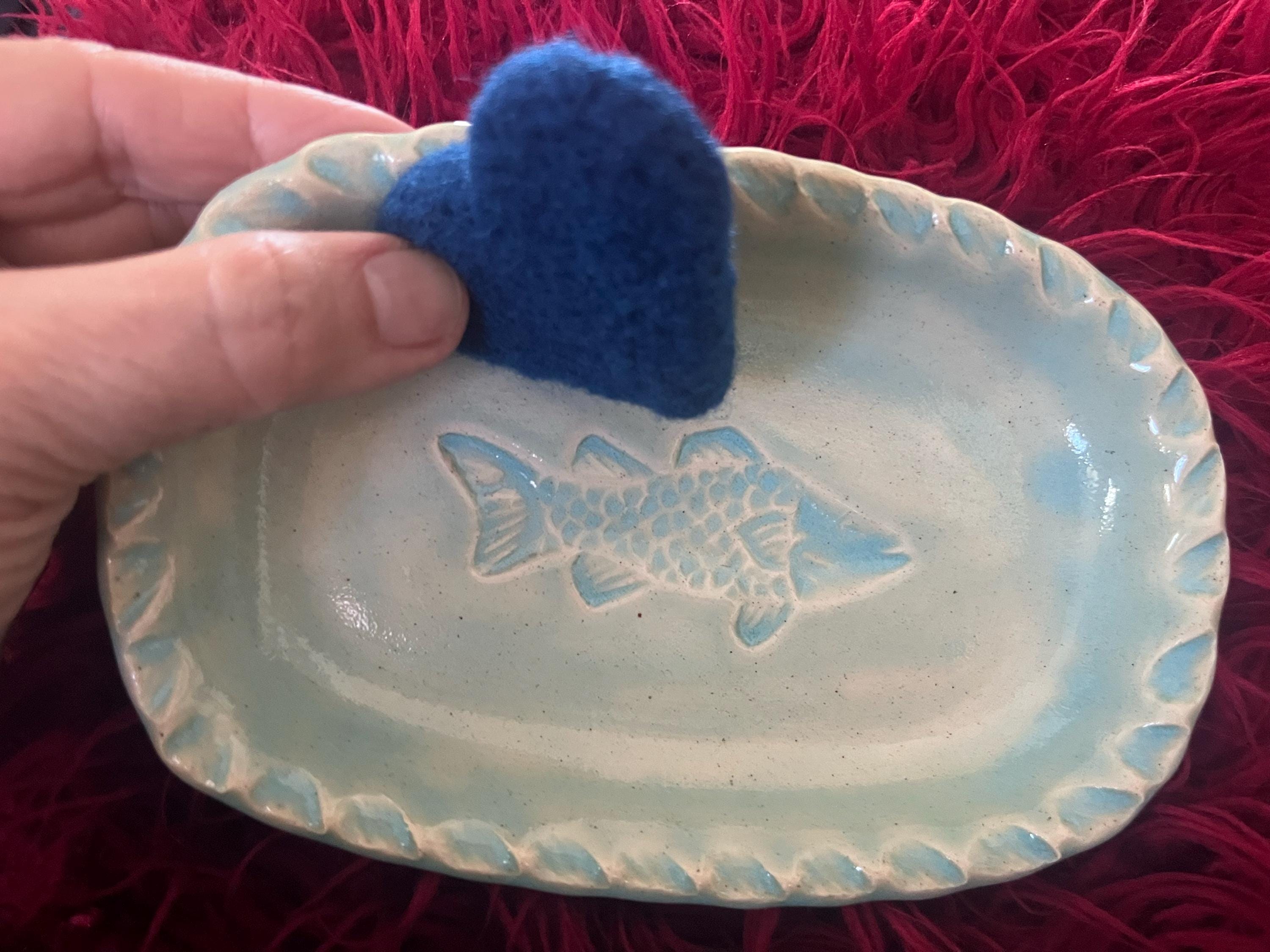 This fish soap dish will look beautiful holding your soap or sponges. This soapdish is made from a white highfire stoneware clay. The light aqua blue glaze gives a beachy tropical feel to this dish. The glazes are all leadfree, foodsafe, and dishwasher safe. The dish measures 6" long by 4" wide.
