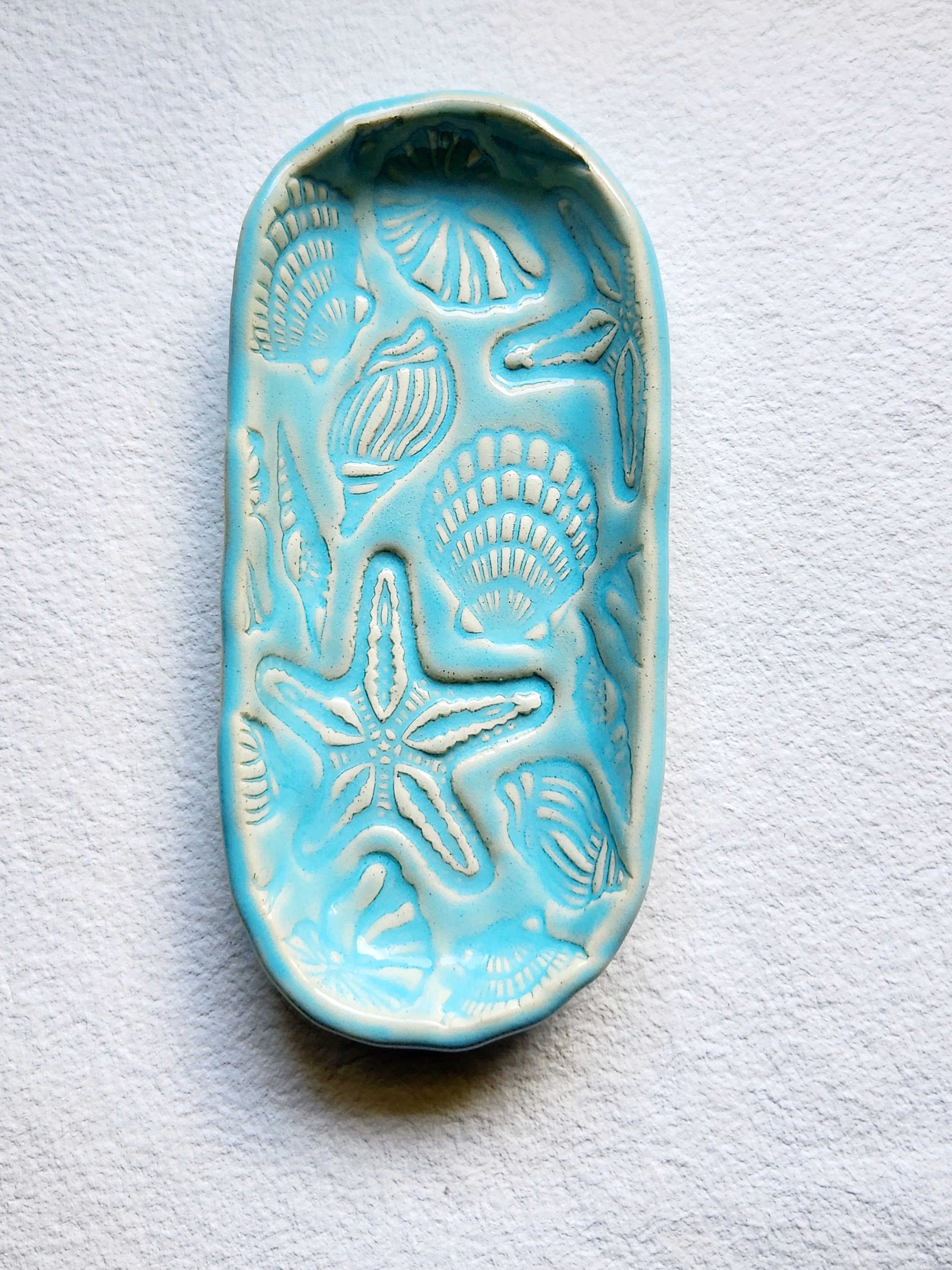 This oblong shell textured serving dish is multipurpose and can be used for serving food or as a beautiful display accent piece. It is the perfect size for a butter dish or can be used for an individual serving of seafood or for putting out some cheese and crackers. It is made from a white highfire stoneware clay. The glazes are all leadfree, foodsafe, and dishwasher safe. The dish measures 7" long by 3.5" wide.