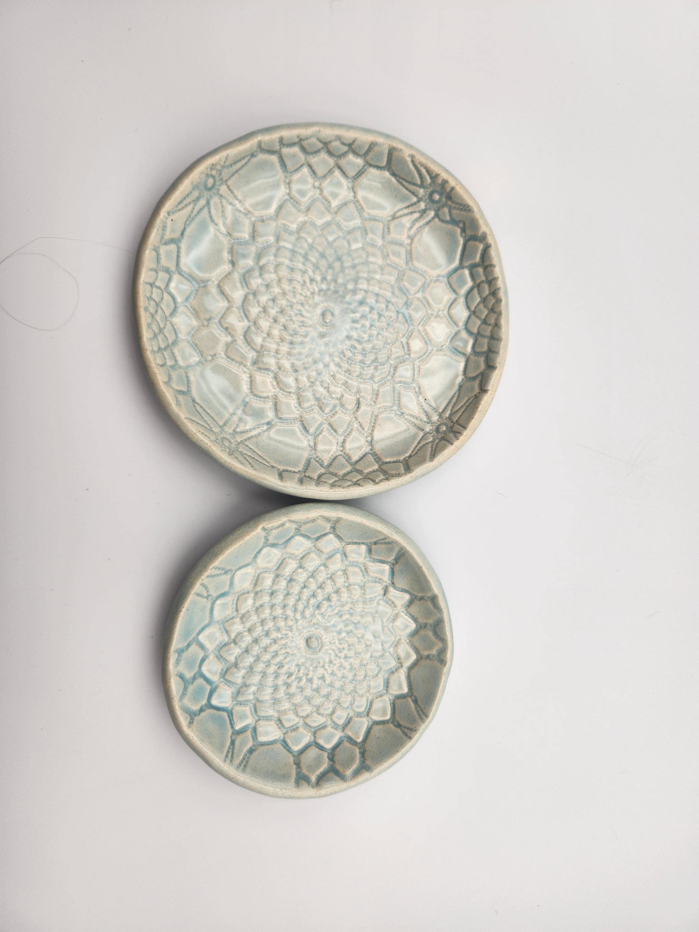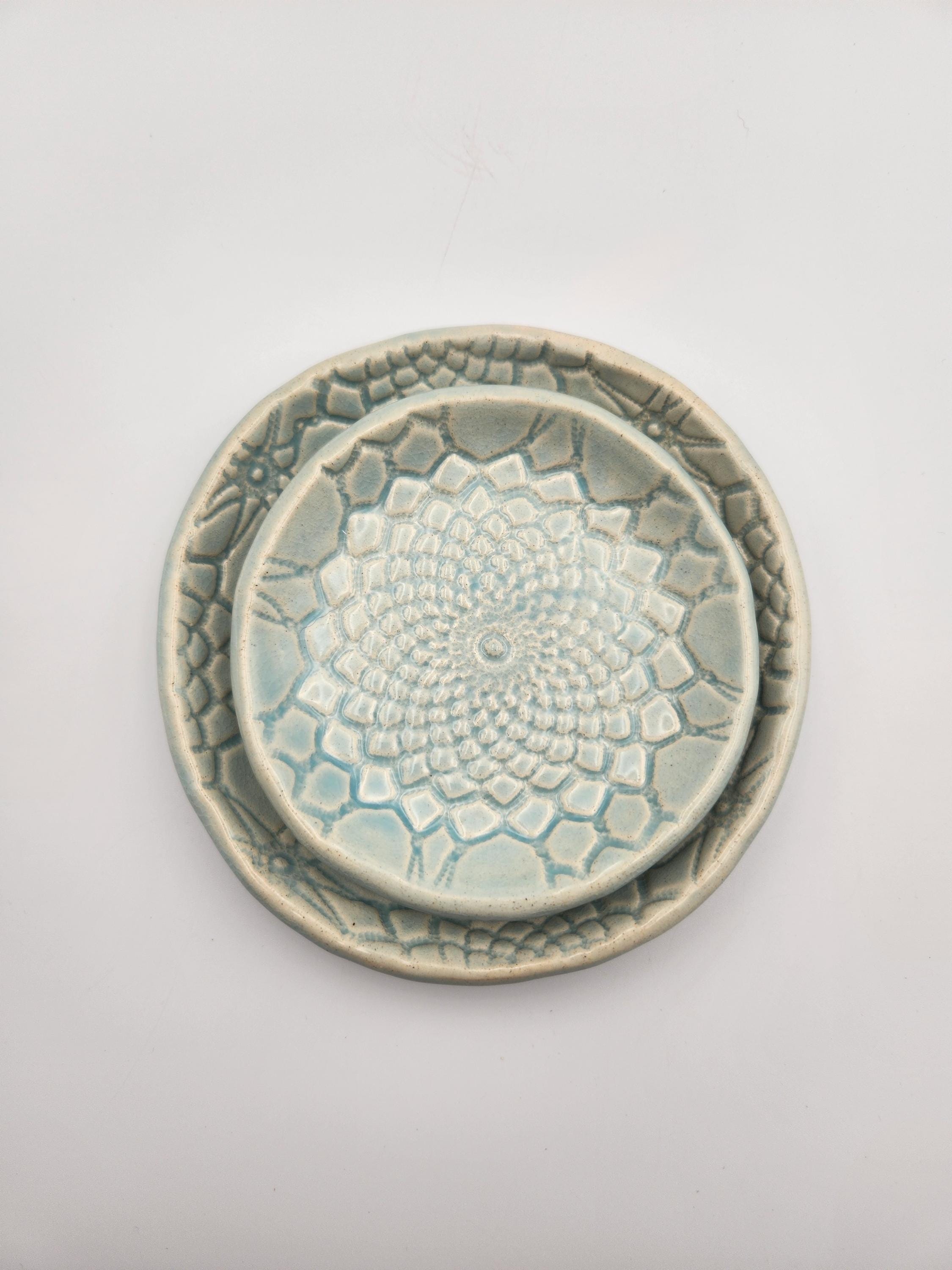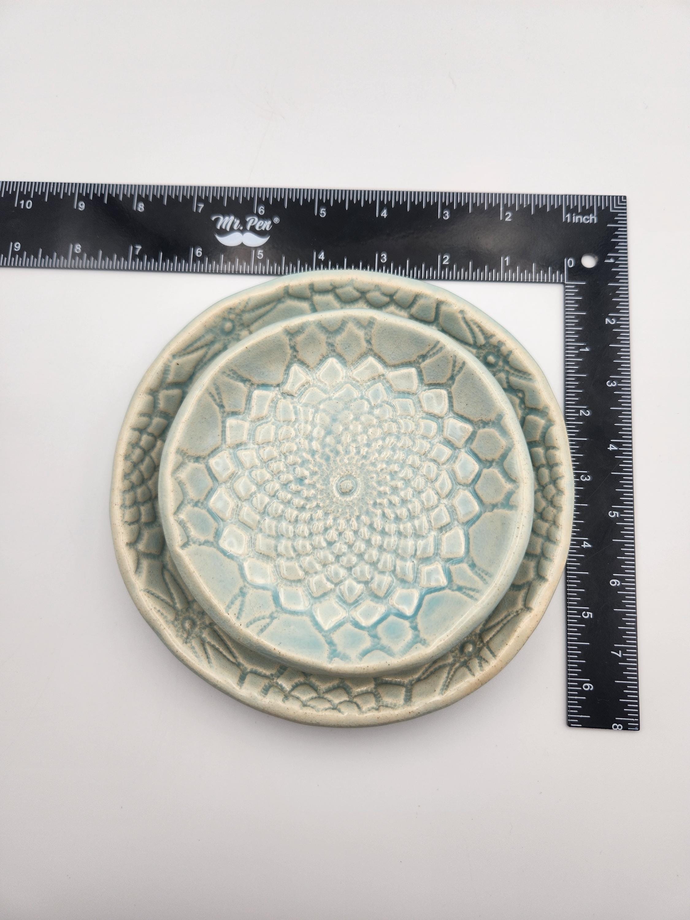 This set includes two lace impressed ceramic sidedish plates. There will be one 6.5" plate and one 5" plate that nest beautifully with each other.