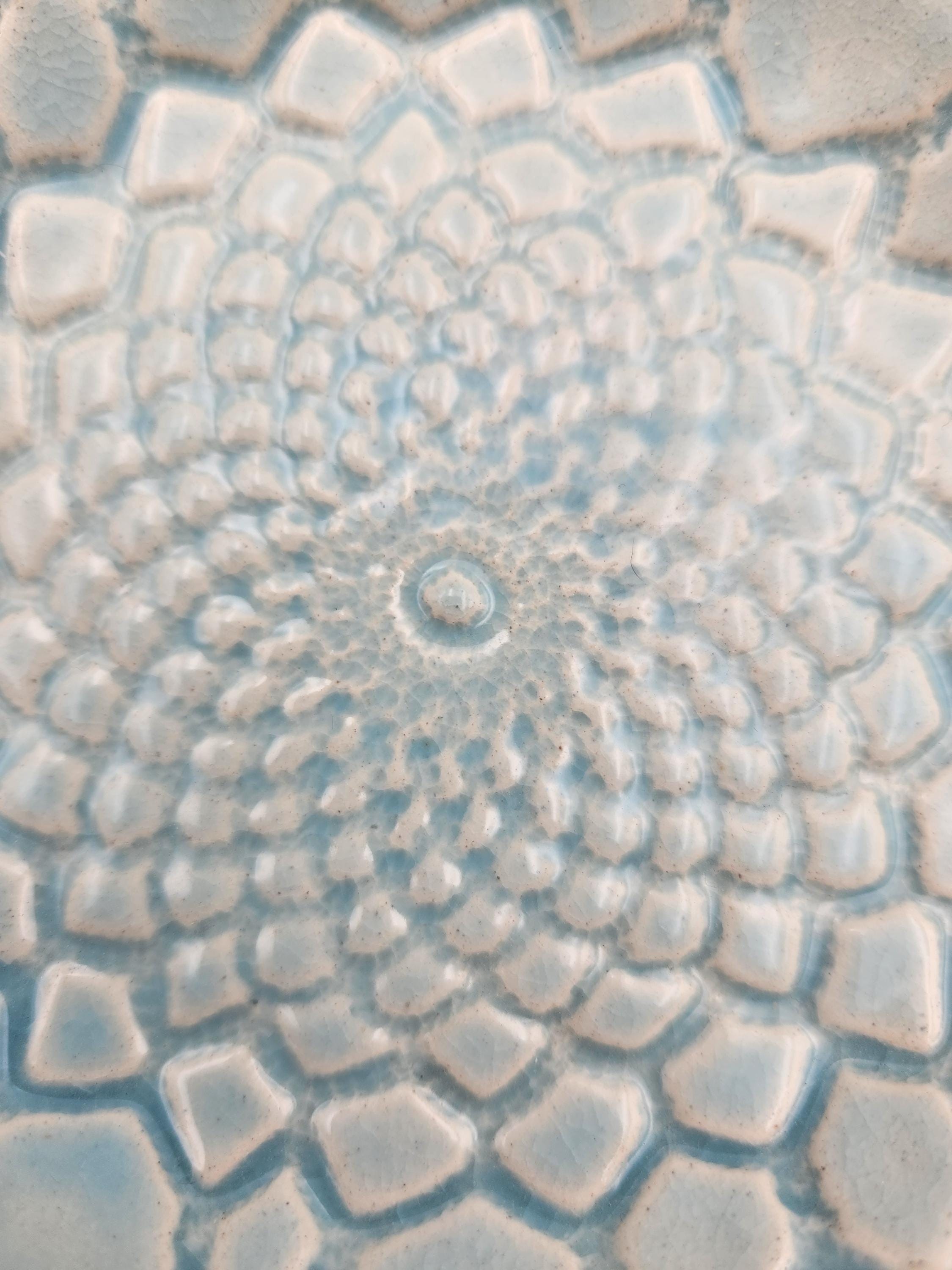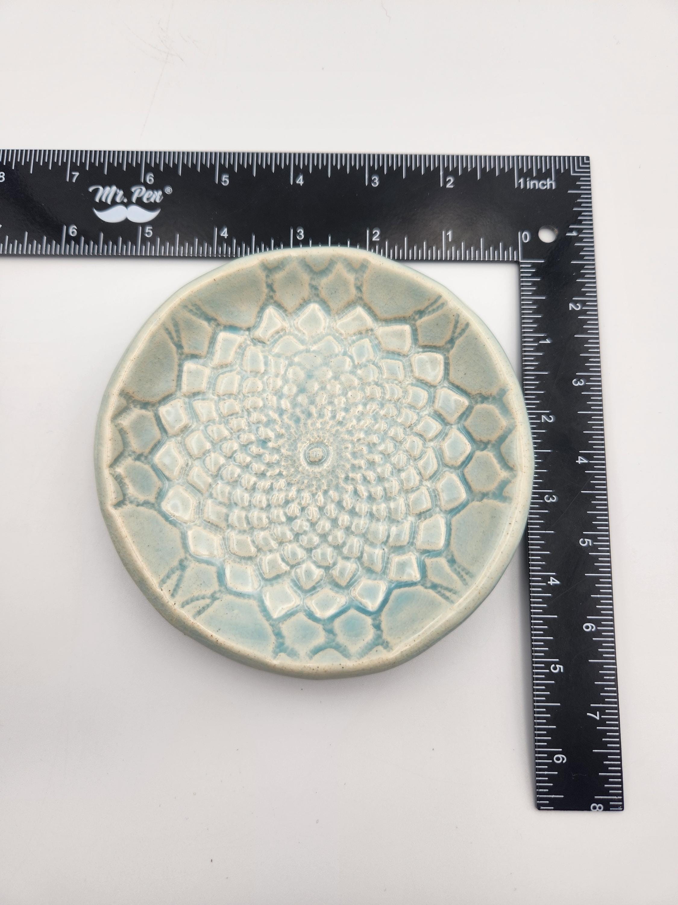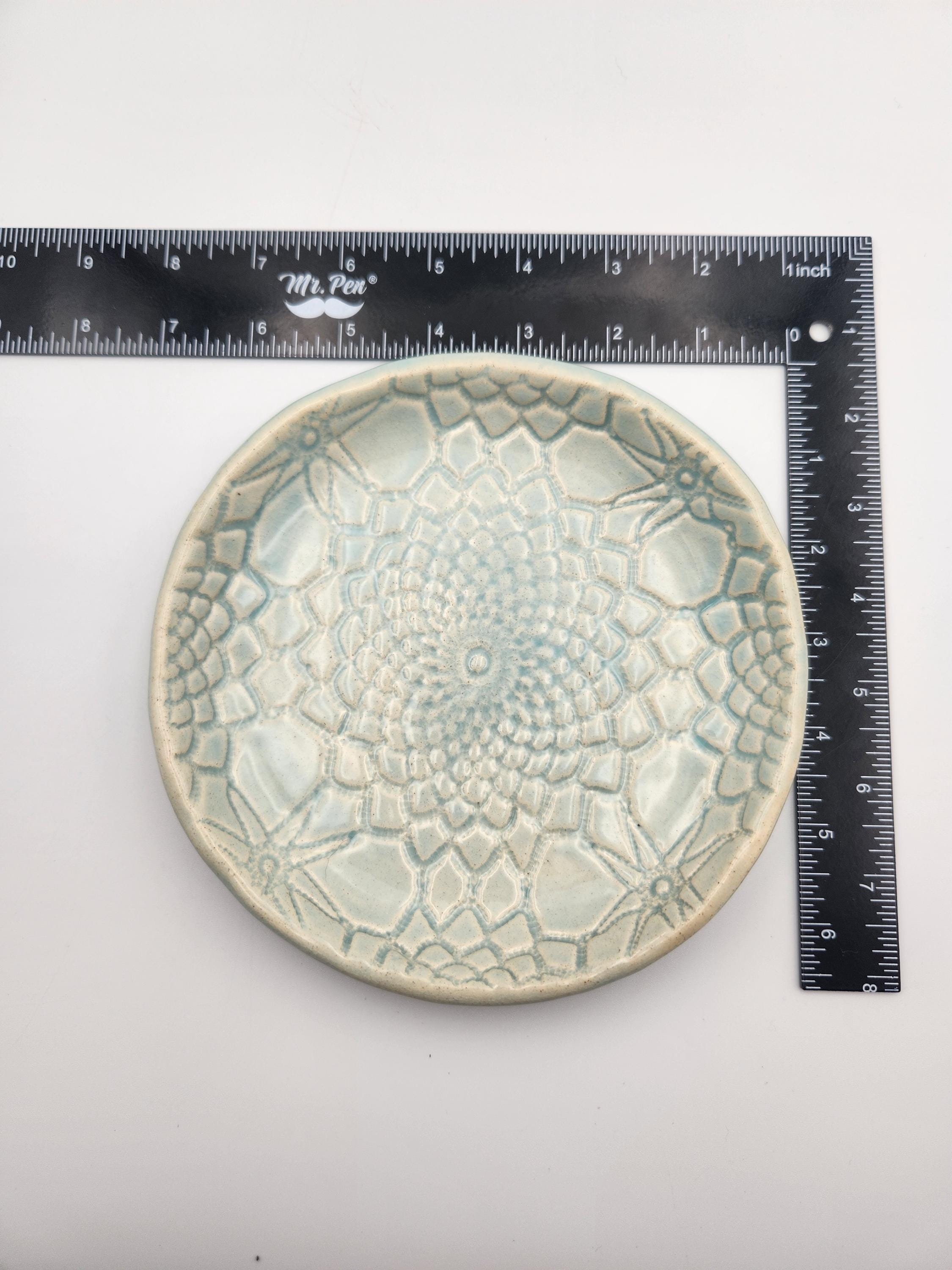 This set includes two lace impressed ceramic sidedish plates. There will be one 6.5" plate and one 5" plate that nest beautifully with each other.
