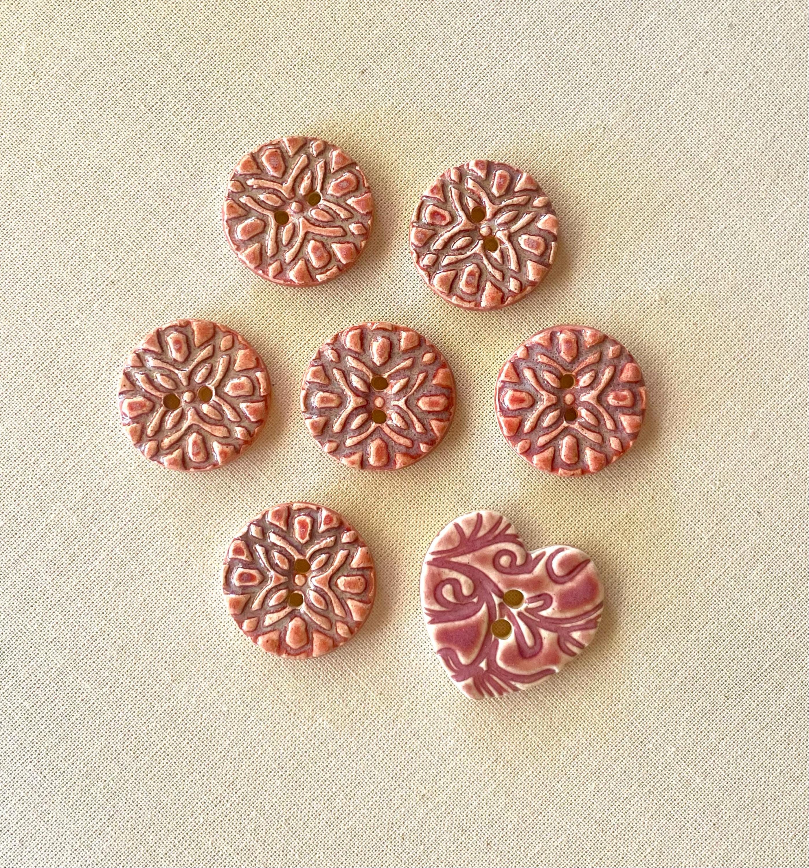 If  these handmade beauties  speak to your crafty creative spirit I hope you can feel the energy and love that I put into crafting it.  Each button that I make is formed by hand, pinched, pressed, squeezed, stamped, and carved.  I carve most of my own clay texture stampers so they are all unique. I take great care in rounding edges and button holes.  I am a fiber artist myself and understand the importance of this so yarns and fabrics don't get snagged. They have all been fired twice. Hand washing is highly recommended.  I cannot guarantee against breakage with machine washing.