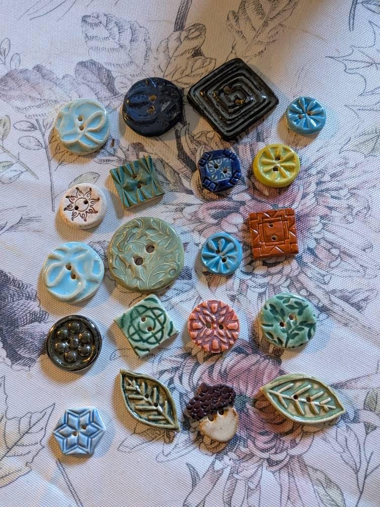 Each of these buttons has been lovingly squeezed, pressed, rolled, and formed by hand. I carve most of my own clay texture stampers so they are all unique. I take great care in rounding edges and button holes. I am a fiber artist myself and understand the importance of this so yarns don't get snagged. They have all been fired twice. Hand washing is highly recommended. I cannot guarantee against breakage with machine washing.