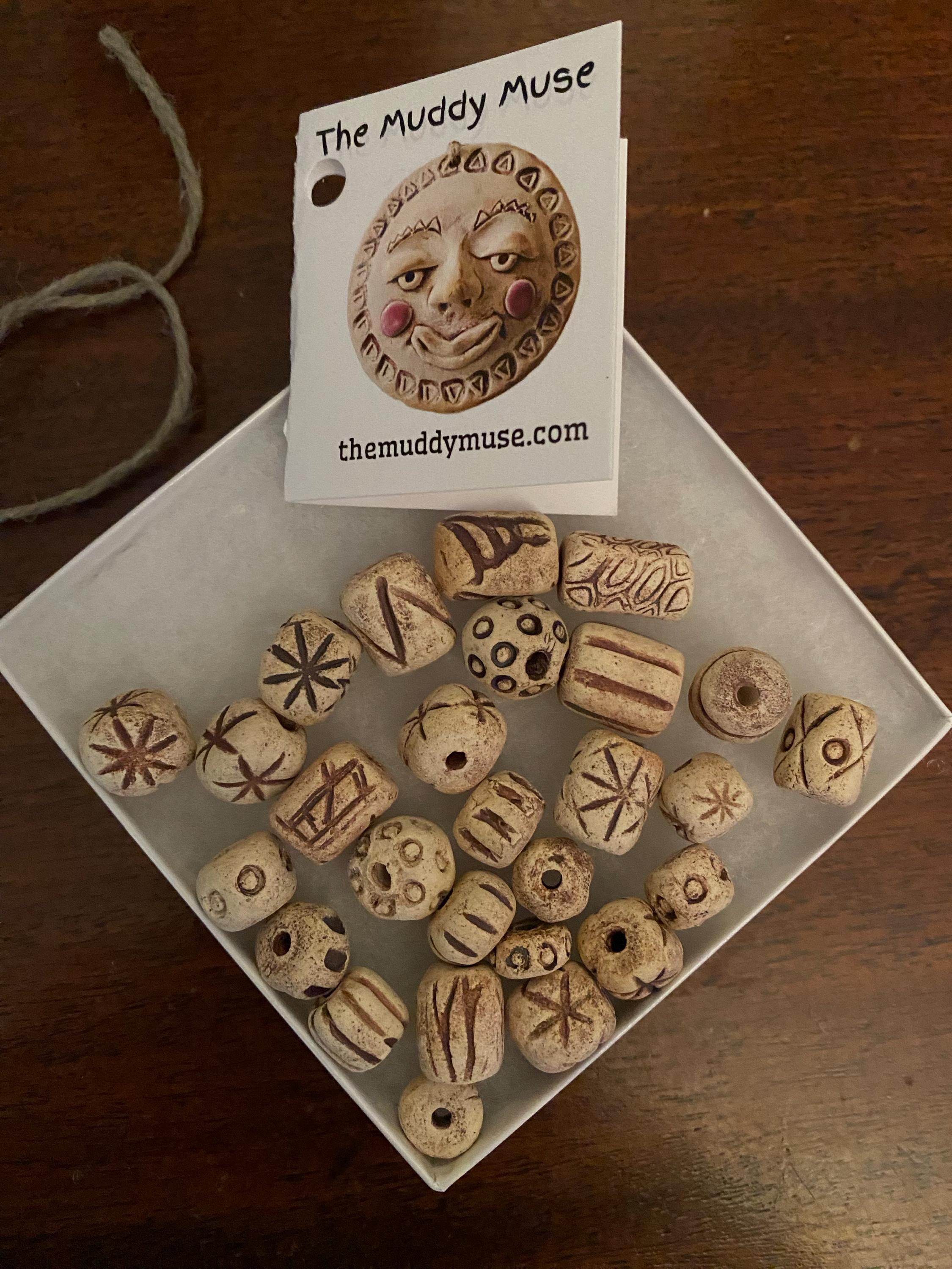 This listing is for a random selection of 25 small handmade clay beads with assorted patterns. Painted with iron oxide.