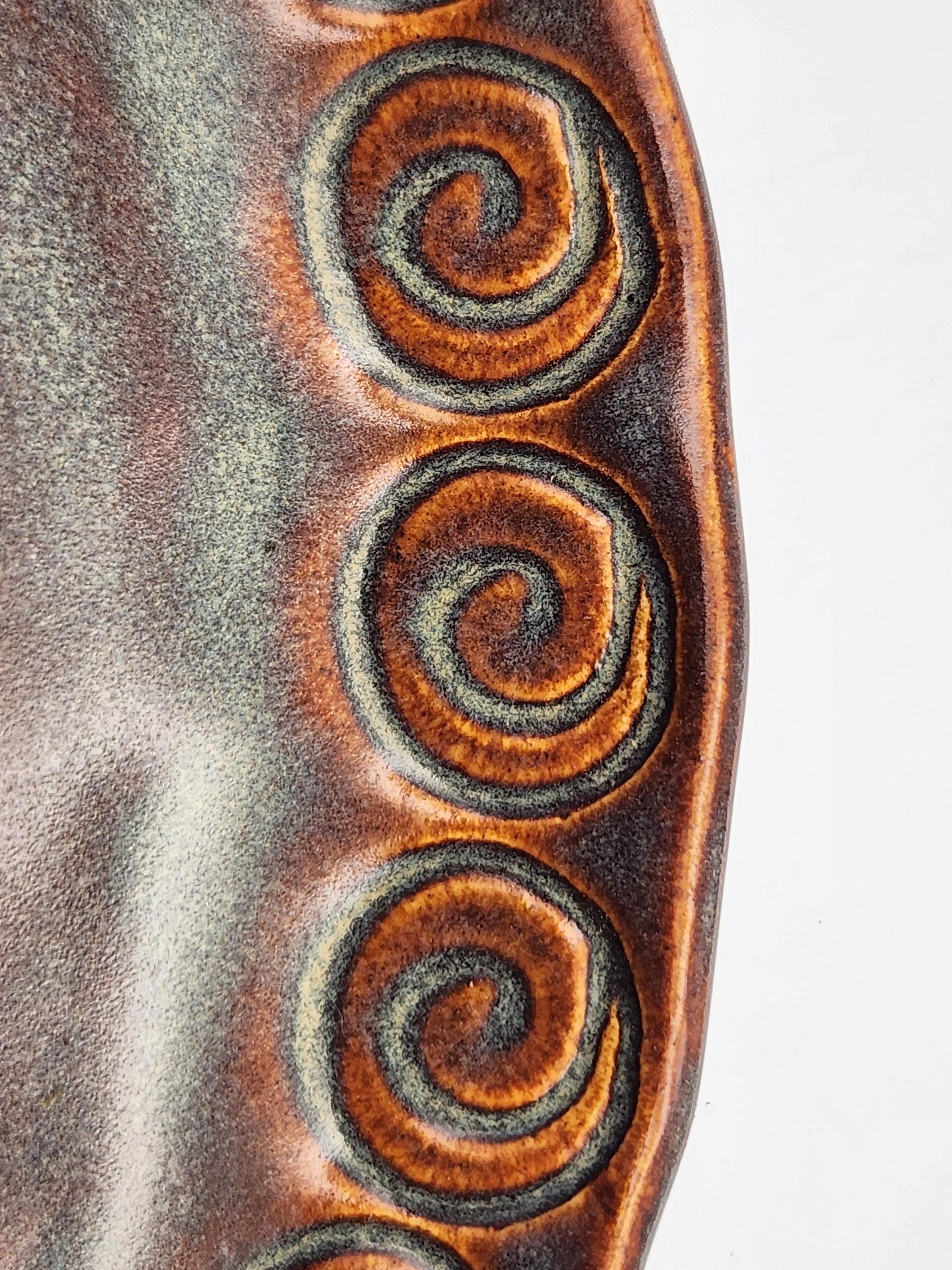 The photo above is a good representation of the dish you will receive. I take great care to make each of these dishes as similar as I can but they are each hand carved and painted and minor glaze variations can occur. Please feel free to request a photo of the dishes I currently have in stock if you want to see the exact item before shipping.