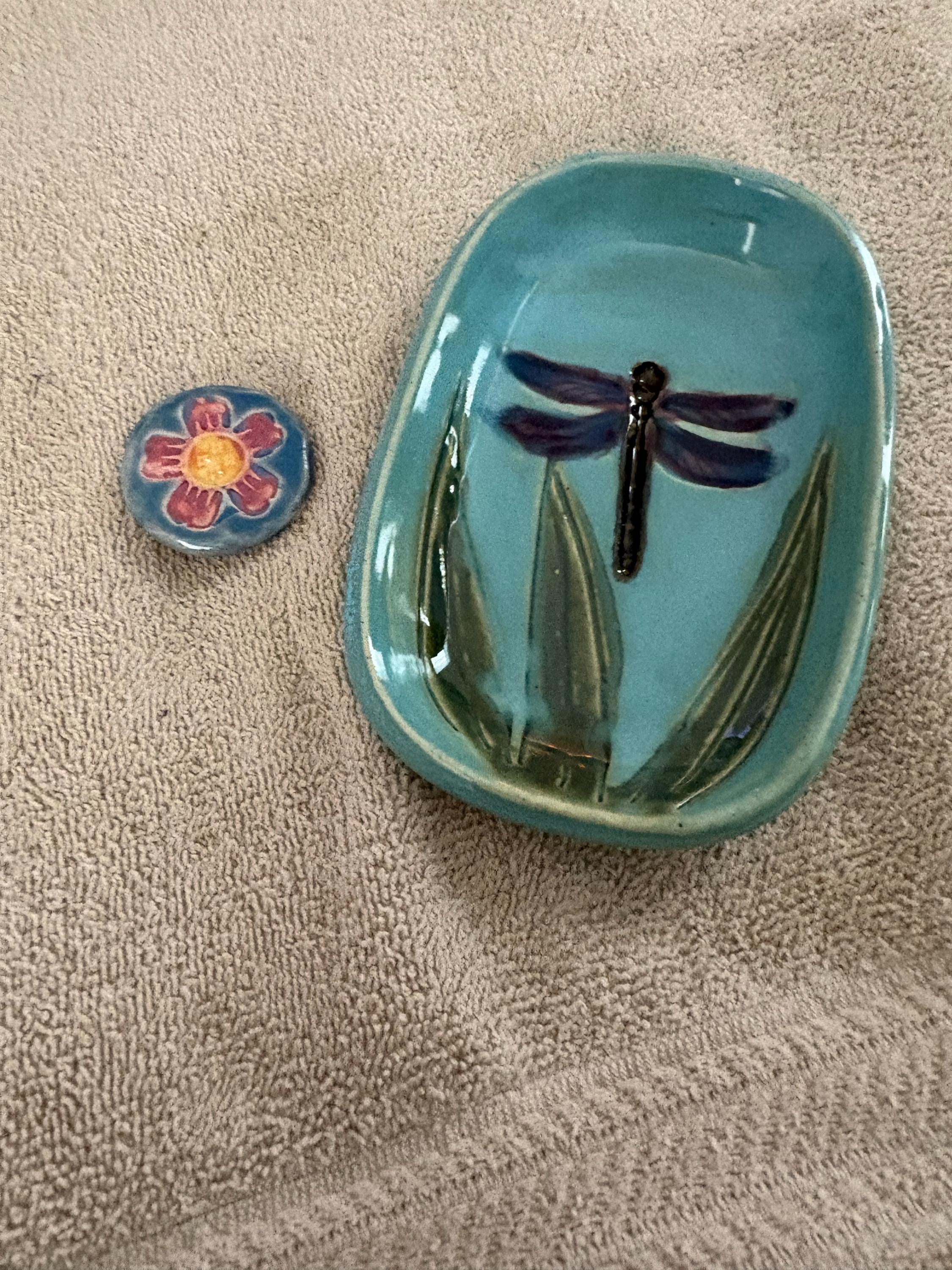 This dragonfly soap dish makes a great accent piece. Each dish varies slightly because of the designs being hand stamped and drawn into the clay. This dish is made with a white highfire stoneware clay and is handpainted with a selection of five different glazes to achieve the beautiful colors. I draw my inspiration from watching the dragonflies in my own garden. This dish measures 4" wide x 6" long and is the perfect size for those large slices of handmade soaps. These would make a great gift for a gardener or nature lover. They also make sweet gifts for a bridal shower. Please let me know if you are interested in ordering a larger number of dishes for gifting or for a special event. This dragonfly design and colorway is available in several other dinnerware style pieces including a tumbler, mug, bowl, plate, platter, and a tall vase. Check out the site for other items that may be in stock.